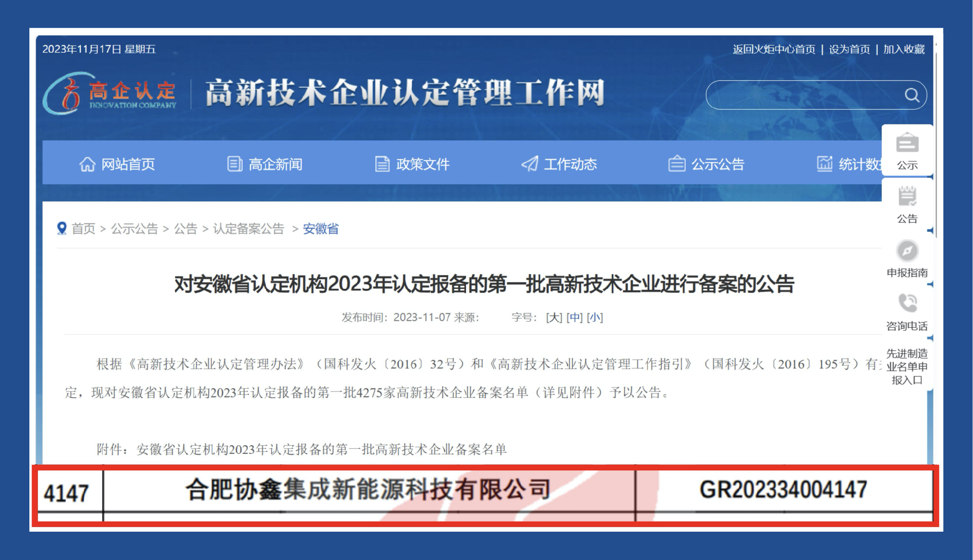 11月7日,全国高新技术企业认定管理工作领导小组办公室公布了《对安徽省认定机构2023年认定报备的第一批高新技术企业进行备案的公告》,合肥利来集团新能源科技有限公司成功上榜,获批“高新技术企业”认定,正式迈入国家高新技术企业行列。