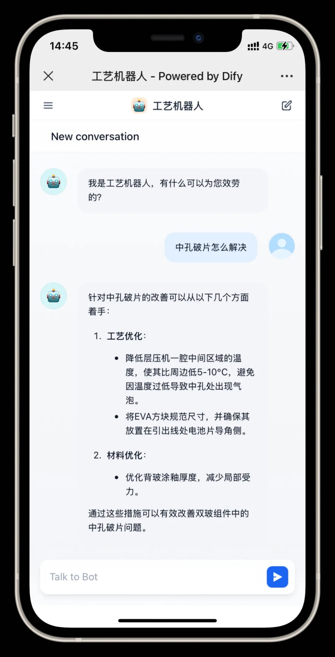 本次创新的核心亮点在于采用私有化部署方案,在确保数据安全的前提下,将新一代大语言模型技术成功应用于光伏制造领域,实现数据安全与智能化的完美结合,其具有不依赖外部网络、离线运行,核心数据全程闭环管理、工艺知识体系完全自主可控等优势。